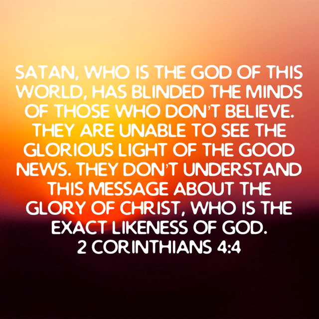 Satan, who is the god of this world, has blinded the minds of those who don’t believe. They are unable to see the glorious light of the Good News. They don’t understand this message about the glory of Christ, who is the exact likeness of God. - II Corinthians 4:4