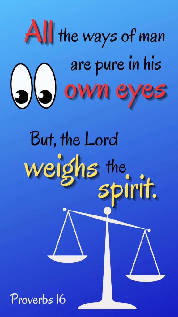 Solomon teaches us that this is a common failing of man. Our inability to be honest and truly examine our intentions and motives. We always believe we have pure motives but is that really the case? Are all of our intentions always good? To ask the question is to answer it. Solomon tells us this is something that man struggles with – truly evaluating our motives. But, he then reminds us that this is NOT a struggle for God. God weighs our spirit. He cuts through the lies we tell ourselves. He sees our true self and our true intentions and then He judges them.