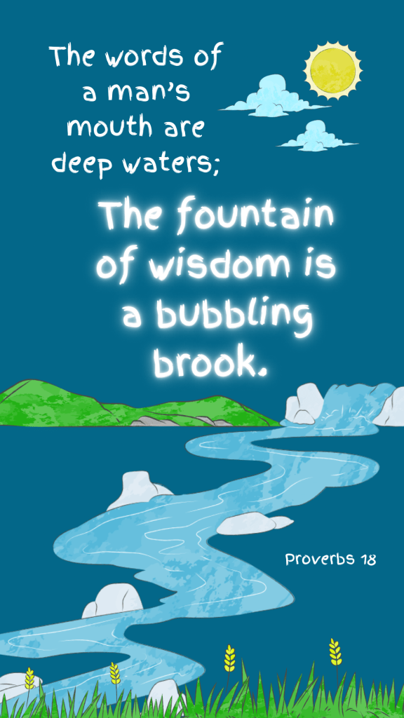 But God’s fountain of wisdom is like a peaceful brook. It won’t drown you. It won’t create more trouble for you. It isn’t dangerous. It’s calming and relaxing. It’s safe and secure. But, it is bubbling meaning it is moving and it will challenge us at times. But those bubbles are meant to keep us refresh and clean just like the babbling brook.