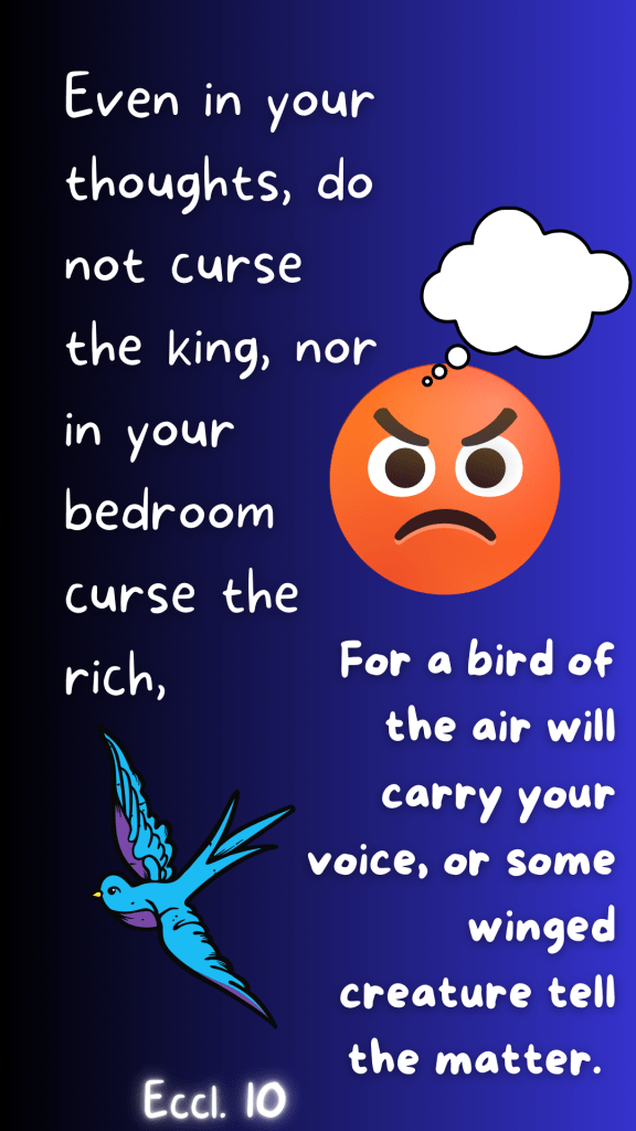 Solomon tells us we should not do that. We shouldn’t think ugly things about our rulers and we shouldn’t curse the wealthy. Why? Solomon basically says you never really know who is listening and a little bird may hear and tell your secrets.
