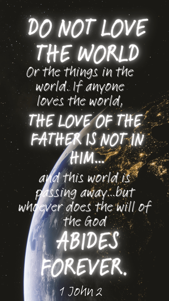 John tells us that we can’t love both God and this world. We can’t have both as our number 1…well because there is only one 1. So, if we’ve allowed the world and its stuff to become #1 in our hearts that by default means God isn’t. And if God isn’t, then we don’t really love God. The desires of this world – of the flesh (my body wants and enjoys something), of the eyes (my mind sees something and wants it), and pride (inflated self worth and importance) – those aren’t from God. They are from the Devil because those desires trump our desires to please God. Our body wants something so instead of reining it in – we do it or consume it. Our eyes see something so instead of being contented we covet and hoard. Our ego wants attention and praise so instead of checking it we give it a free pass to blind us to the reality of our position to God and others.