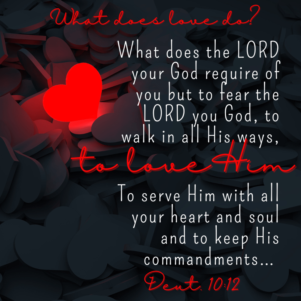 Moses ask the Israelites a rhetorical question. Because the Lord has saved you what then does He require? Is fearing, obeying, serving, and loving Him too much? NO! It is the least you can do and He requires it for your own good.